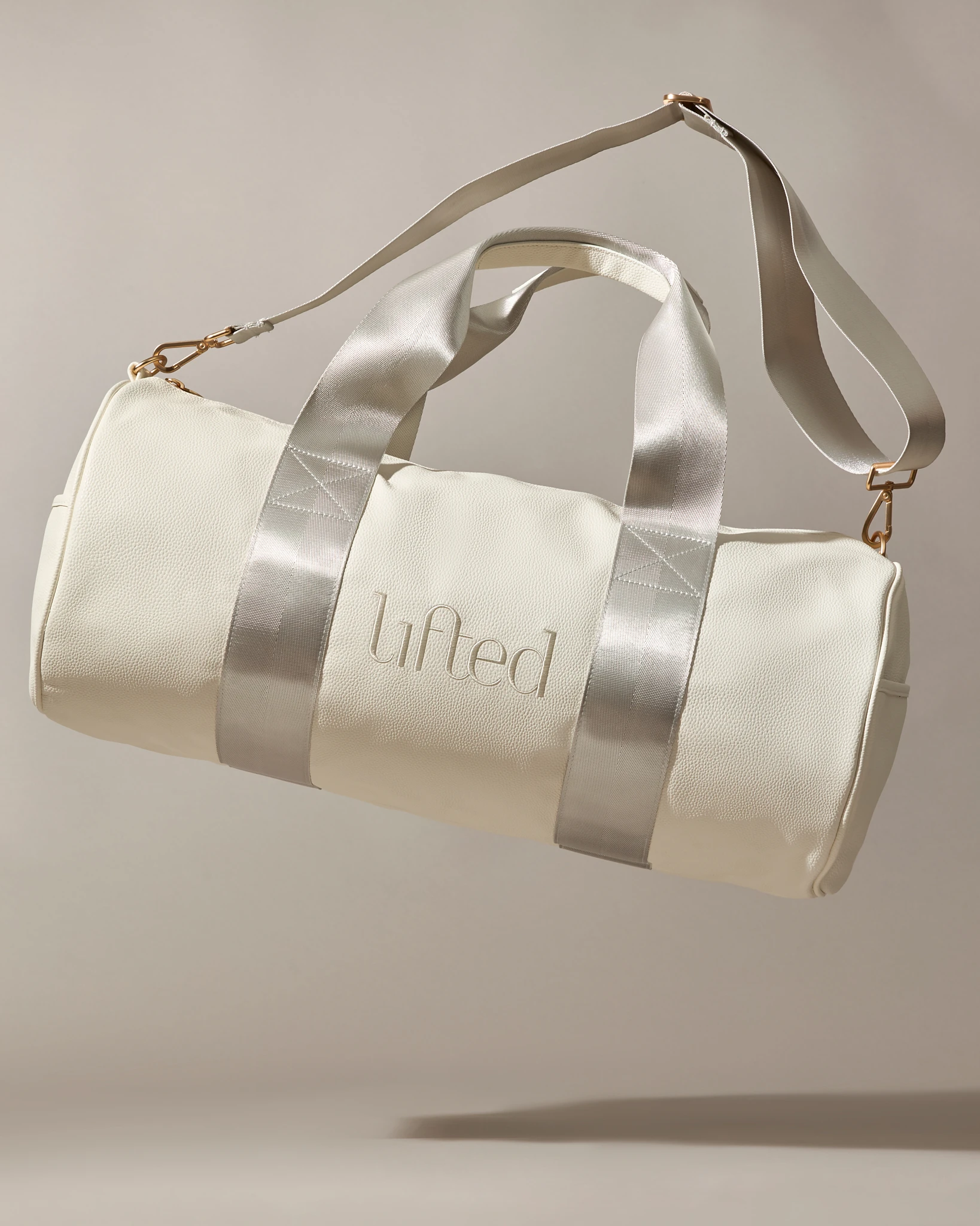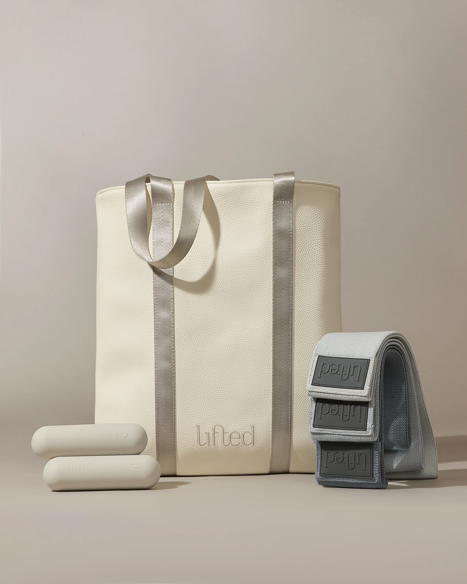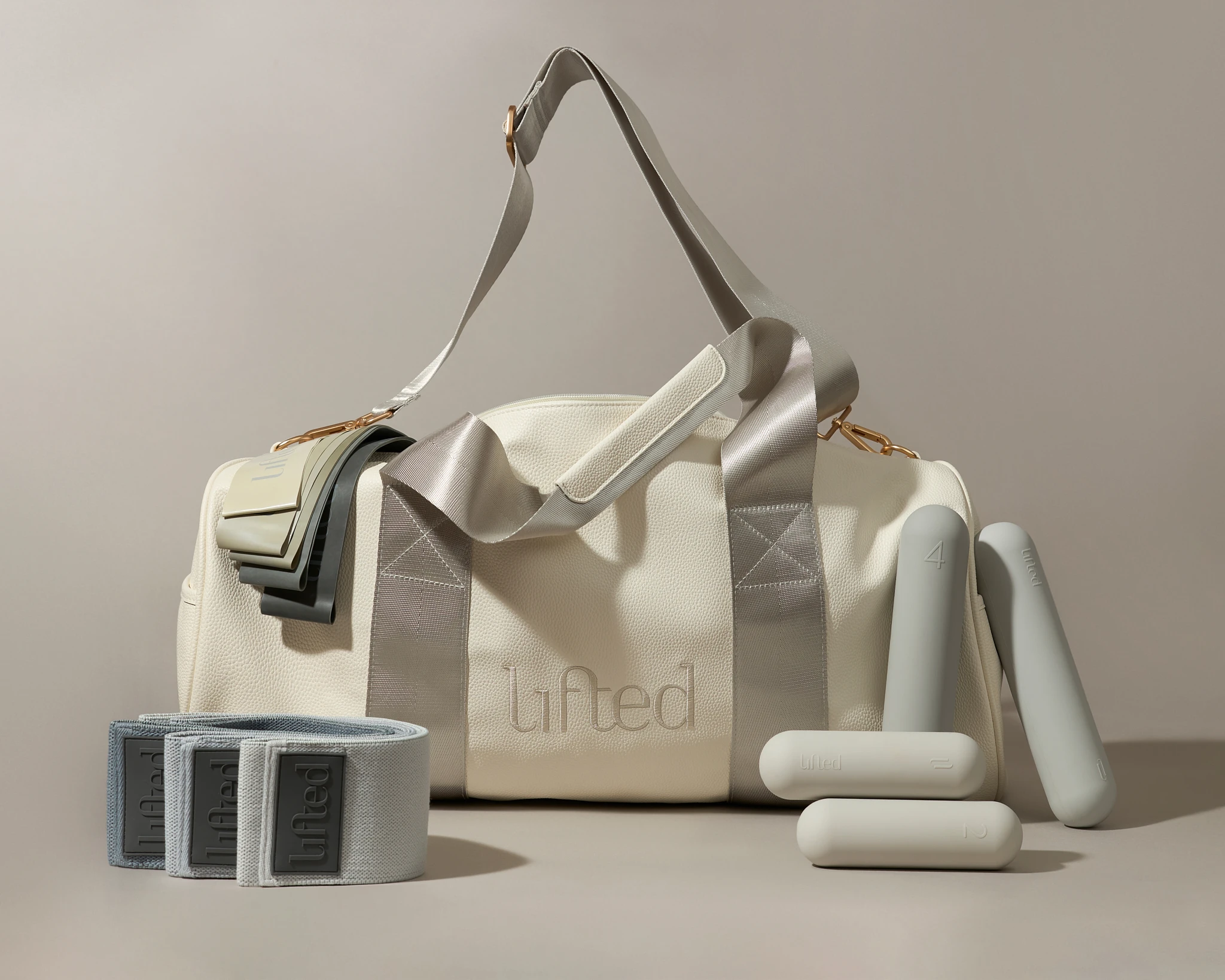 The marble-surfaced lifestyle images position the products as interior accents. The detail shots show craftsmanship: stitching quality, hardware finish, how resistance bands weave, and how zippers sit. The full-set layouts clarify what comes in each package and how pieces scale relative to each other. Together, the images make Lifted Movement's material quality and design intention visible before a customer ever holds the product.