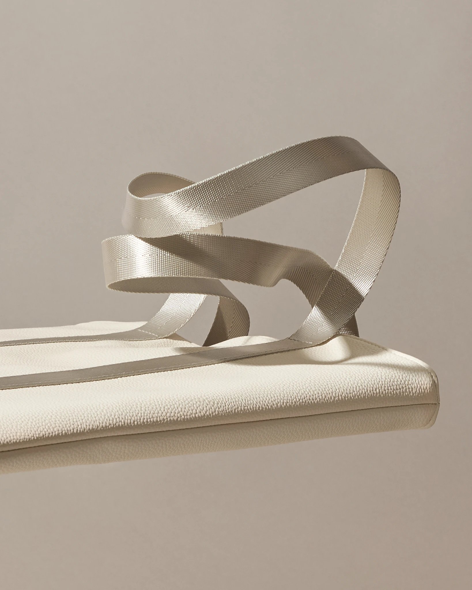 "caption": "Color-accurate product photography showing true cream fabric texture and matte silicone finish on Lifted Movement's premium home fitness equipment using controlled neutral lighting.",